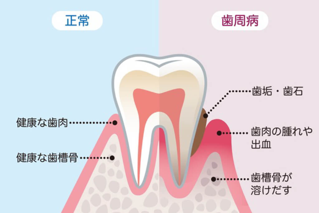 歯周組織は、歯肉・歯根膜・セメント質・歯槽骨の4つに分かれます。何らかの原因でいずれかの部位に炎症が起こると、歯周病を発症します。病態としては、痛みを伴わずに進行することから慢性疾患に該当します。