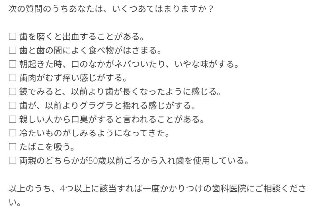 ――多くの方が歯周病に感染しているにも関わらず、実際に歯科に通っている方は少ないのが現状なのですね。では、どのようにセルフチェックをしたら、早期発見につながるでしょうか?